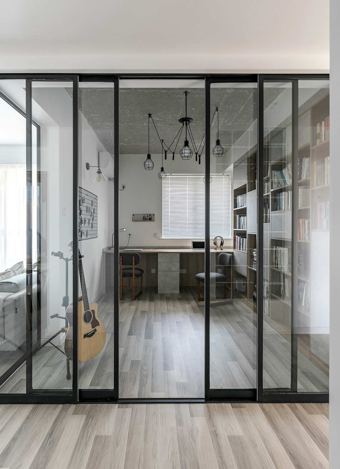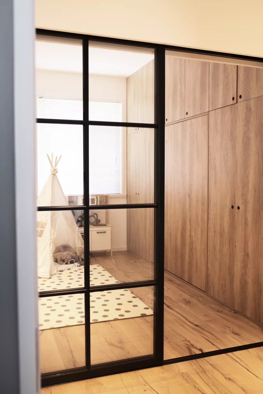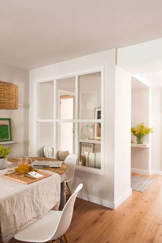 一扇门高容貌的室内外窗,既搞定了光线昏暗间题,又为家里增色许多 。